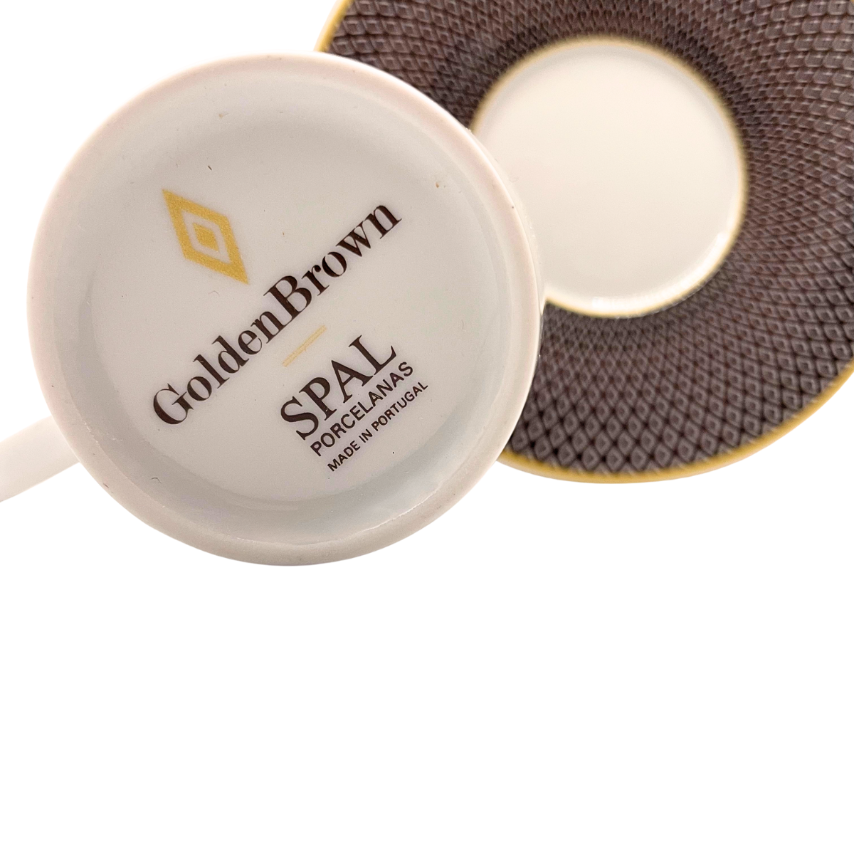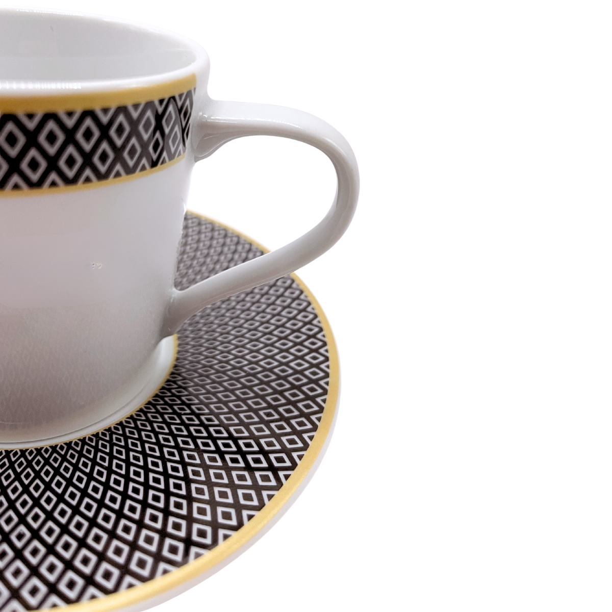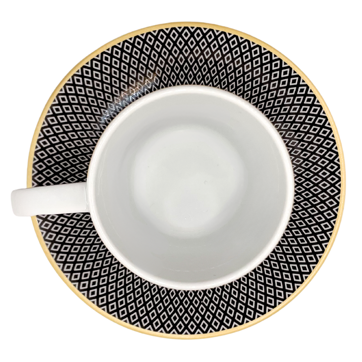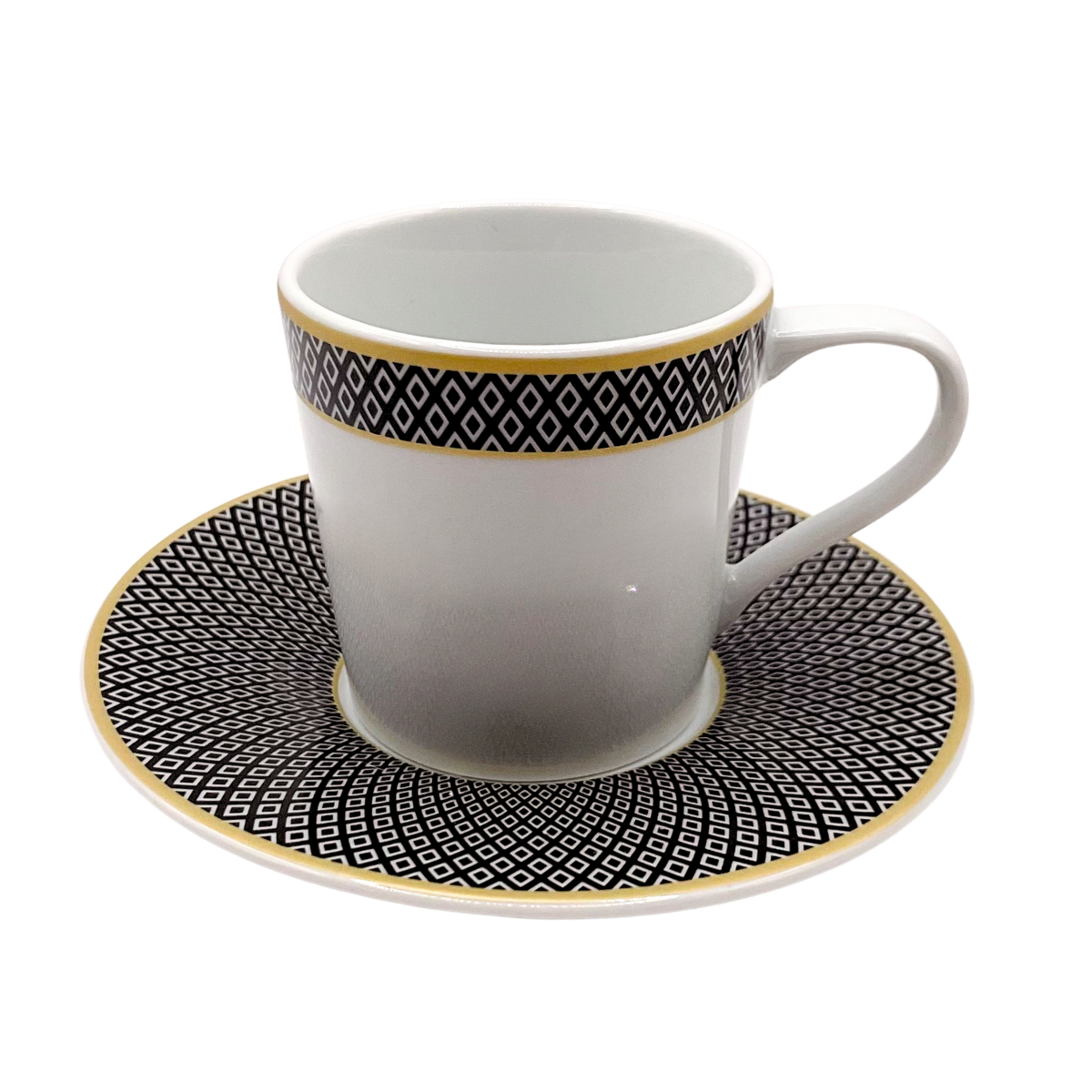 Elegancka filiżanka do espresso z portugalskiej ceramiki marki SPAL. Subtelna forma została połączona z dekoracyjnym, geometrycznym wzorem w odcieniach czerni i złota, który nadaje całości wyjątkowo stylowy i ponadczasowy charakter.