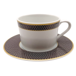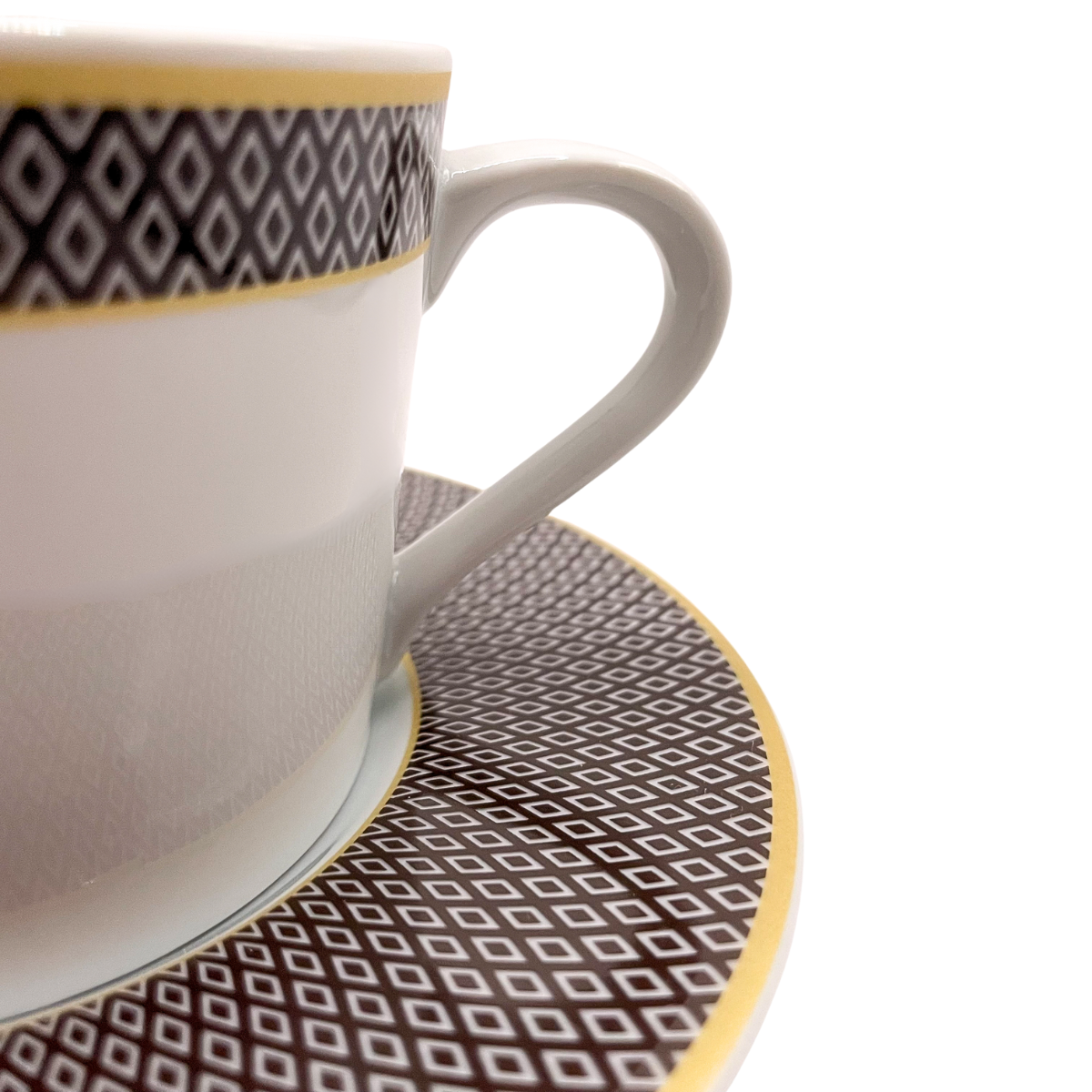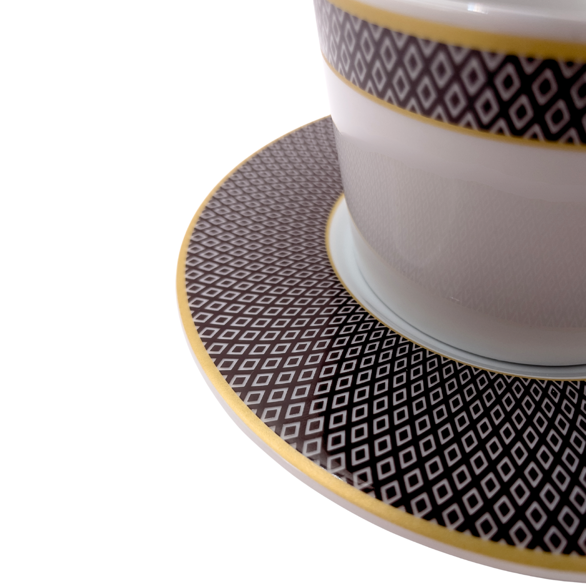 Filiżanka z portugalskiej ceramiki marki SPAL, idealna do kawy, cappuccino lub herbaty. Subtelna, klasyczna forma została połączona z dekoracyjnym geometrycznym wzorem w odcieniach czerni i złota, który nadaje całości ponadczasowy, stylowy charakter.